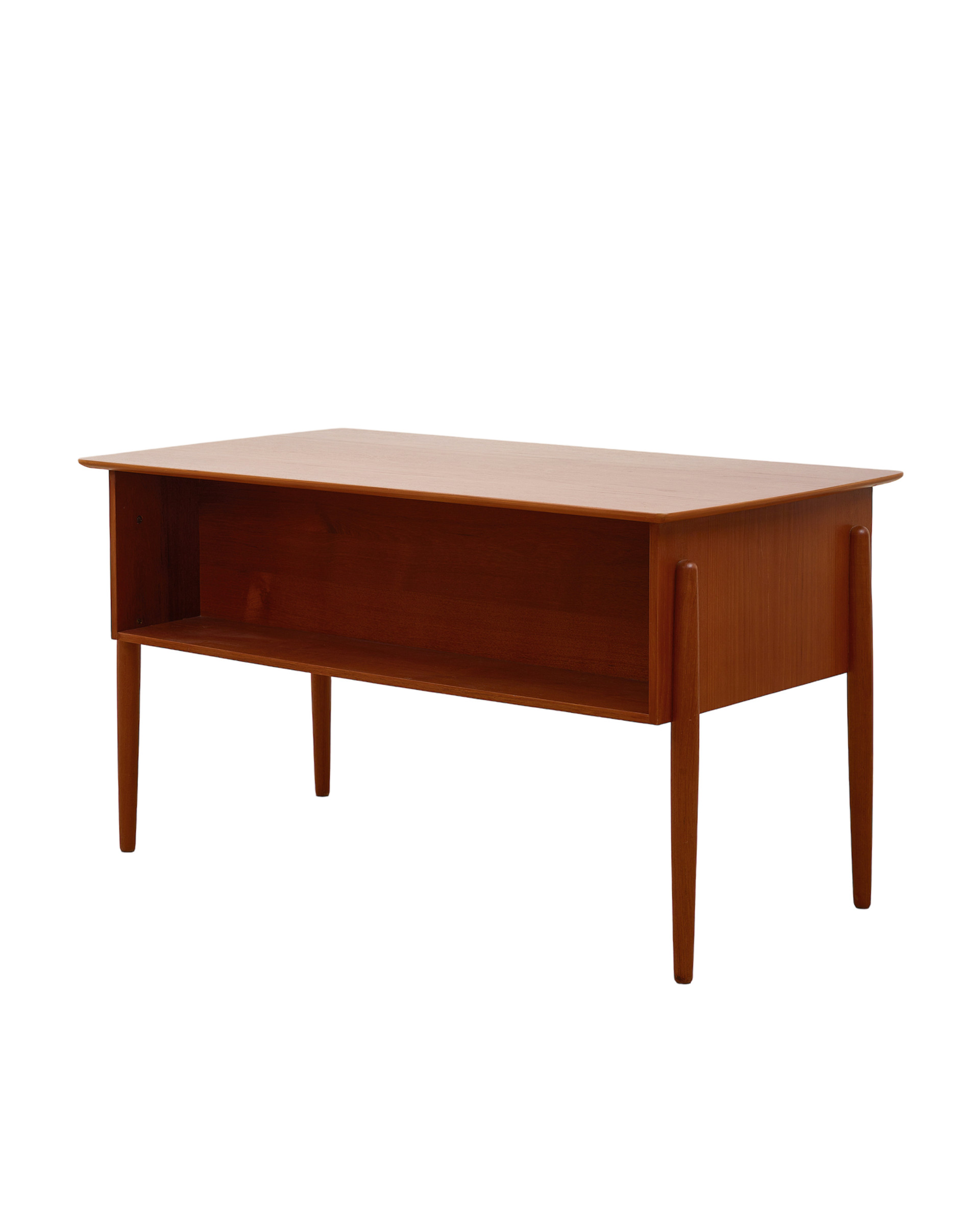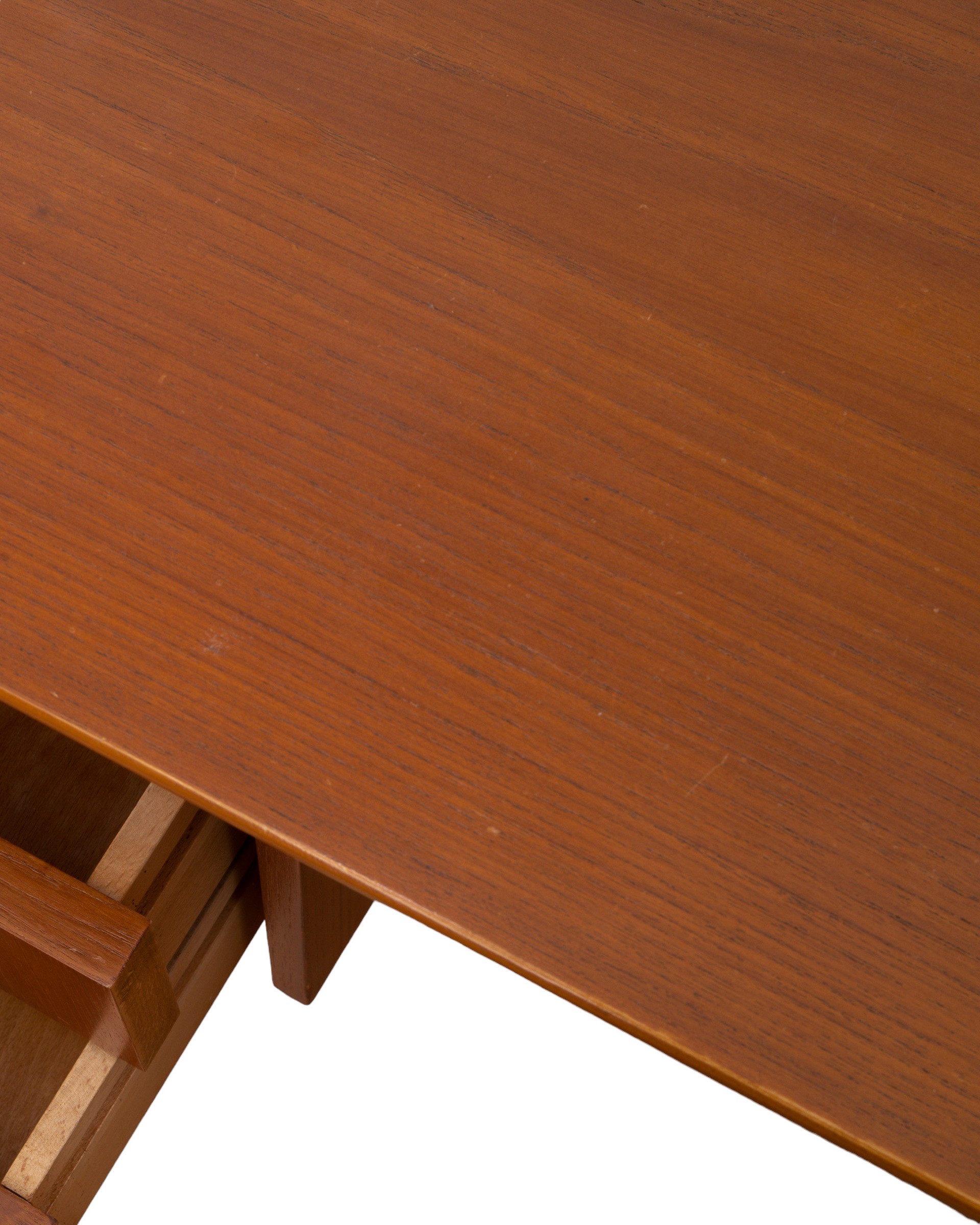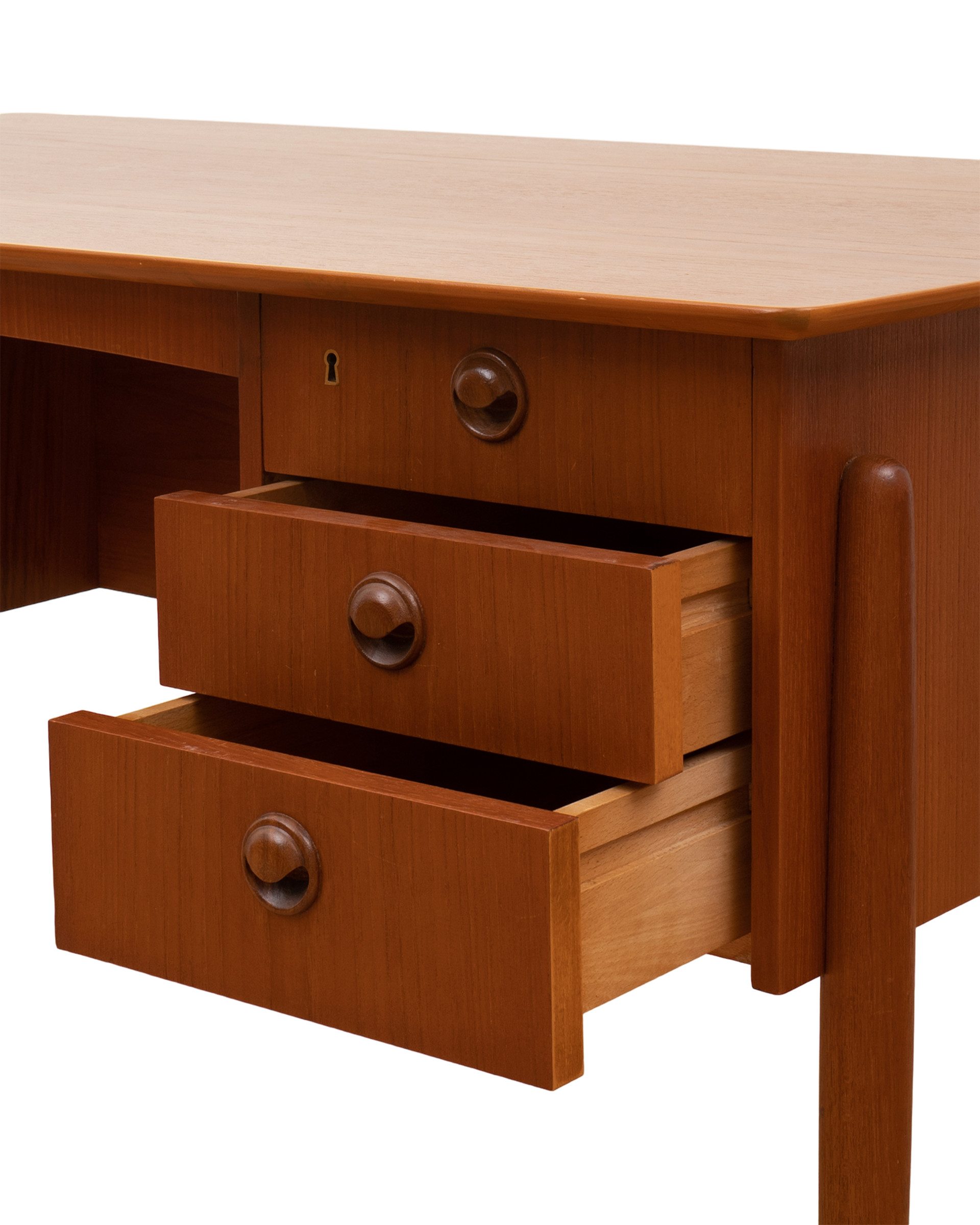 (Vintage) 국내 패션 브랜드를 운영하는 김00 대표님이 위탁하신 데스크입니다. 전면에 여섯 개의 부드러운 슬라이딩 서랍과 두 개의 잠금식 서랍(열쇠 포함)이 있으며, 새 부리를 형상화한 듯한 귀여운 손잡이가 달려 있습니다. 문을 바라보고 놓는 프리스탠딩 데스크로 책상 뒤쪽에 넉넉한 수납공간이 마련되어 있으며, 공간에서 하나의 오브제와 같은 모습으로 자리합니다.