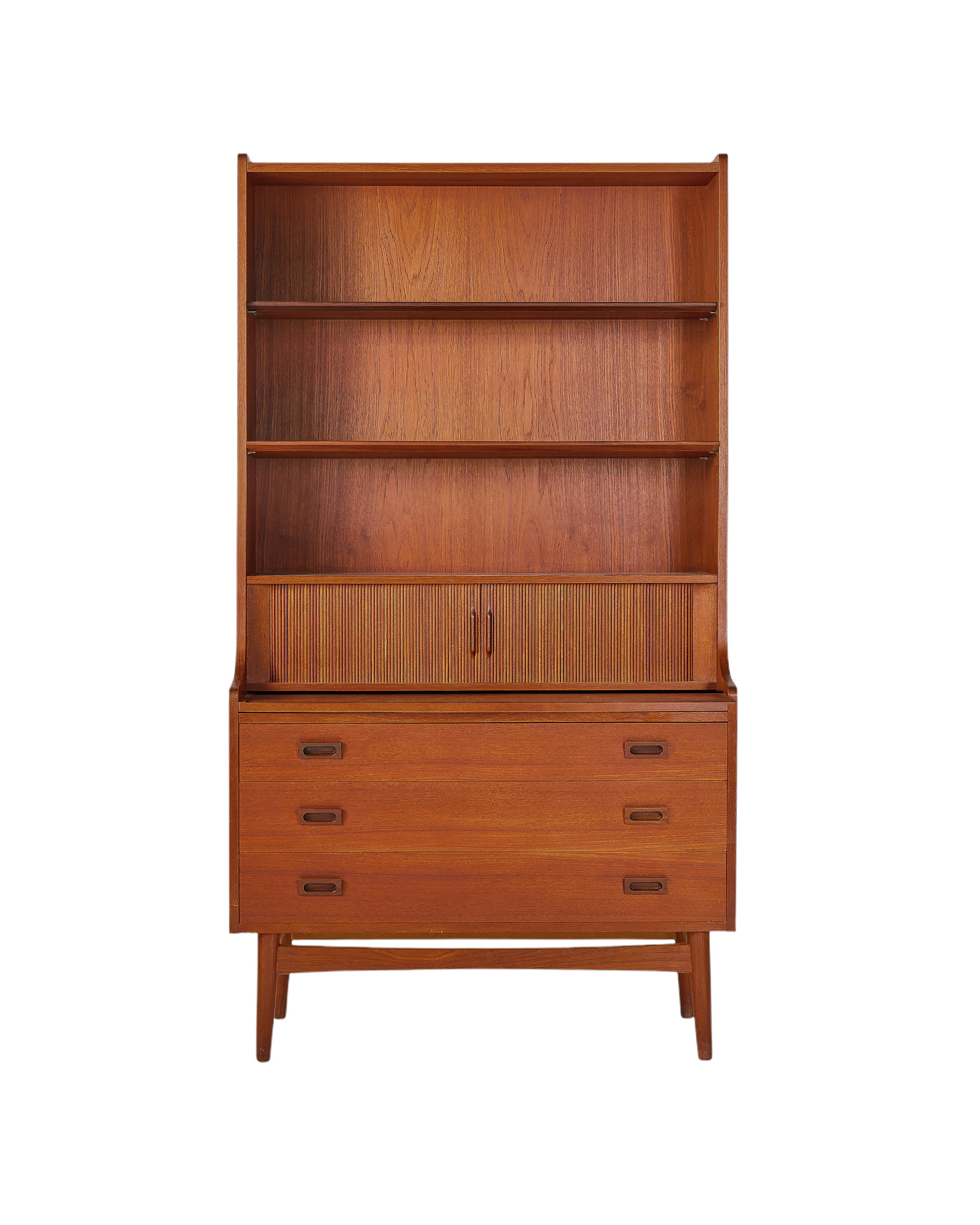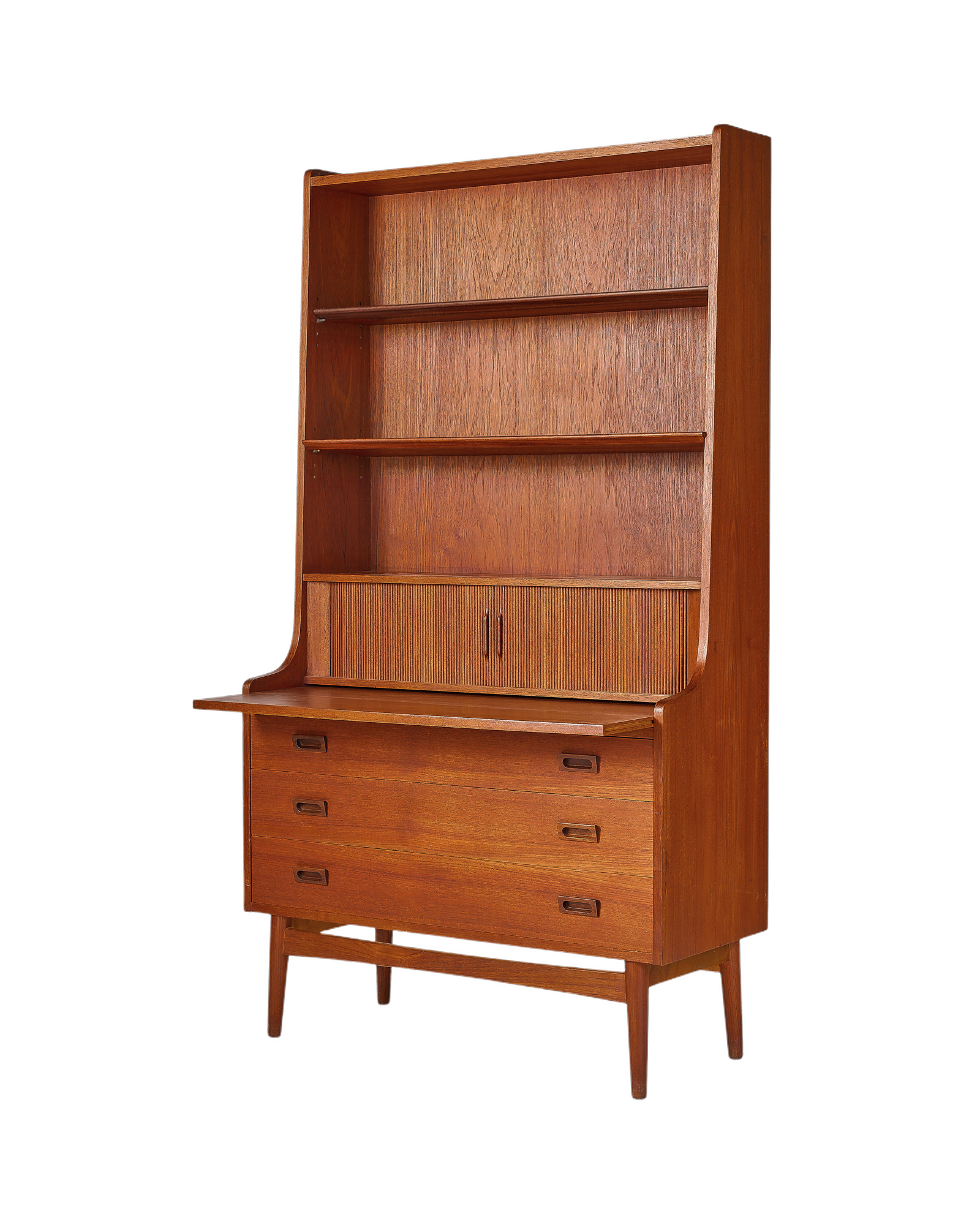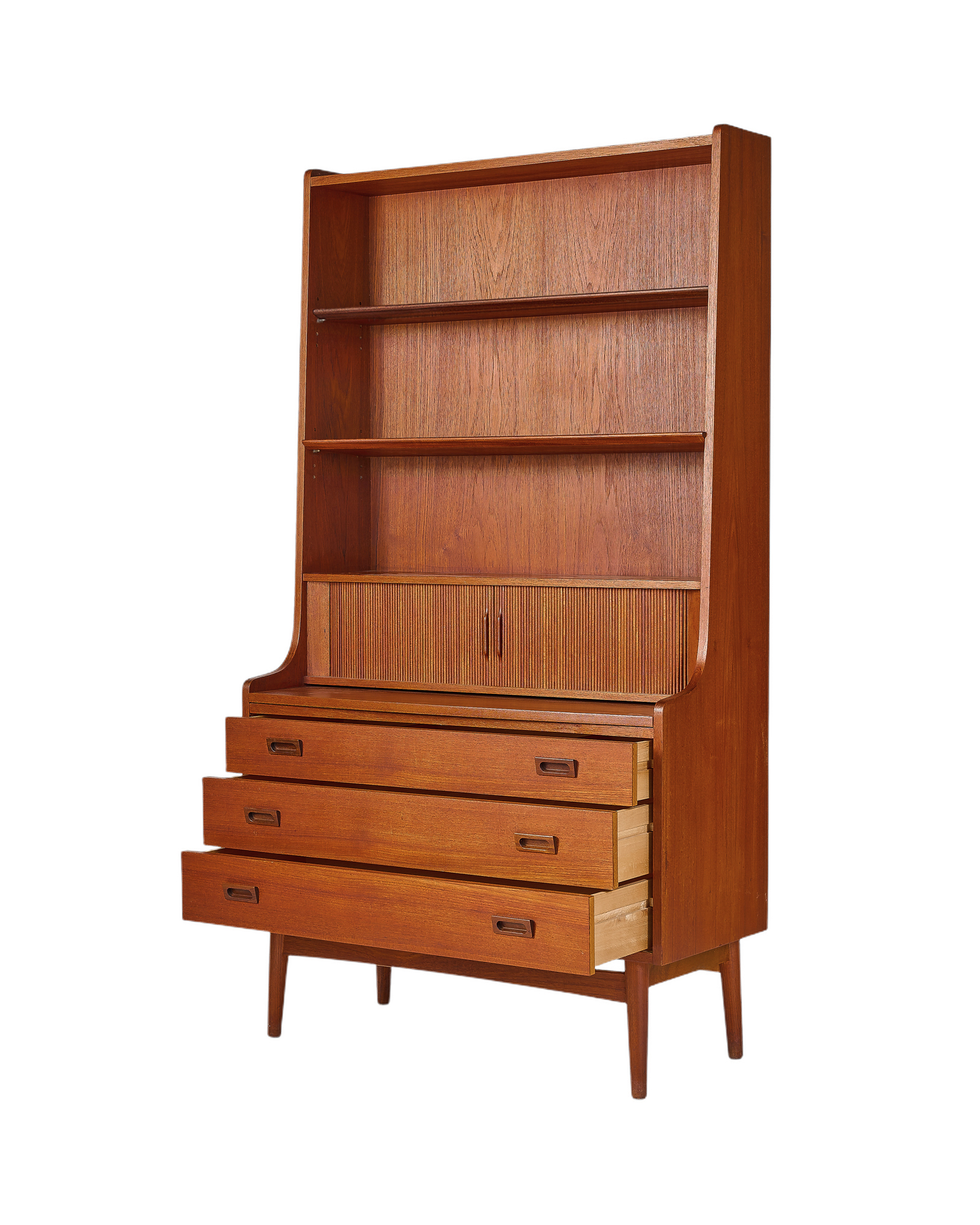 "우드 애호가 분들이라면 어디에선가 한 번쯤은 보셨을 북케이스입니다. 앞모습이 특별히 아름다운 가구이지만 45도 각도에서 보는 실루엣은 더욱 아름답습니다. 탁월한 수납공간과 서랍형 책상, 부드럽게 열고 닫는 탬부어 도어는 이 가구를 더욱 특별하게 만들어줄 요소입니다." - 빈티지 가구 컬렉터 이00 님