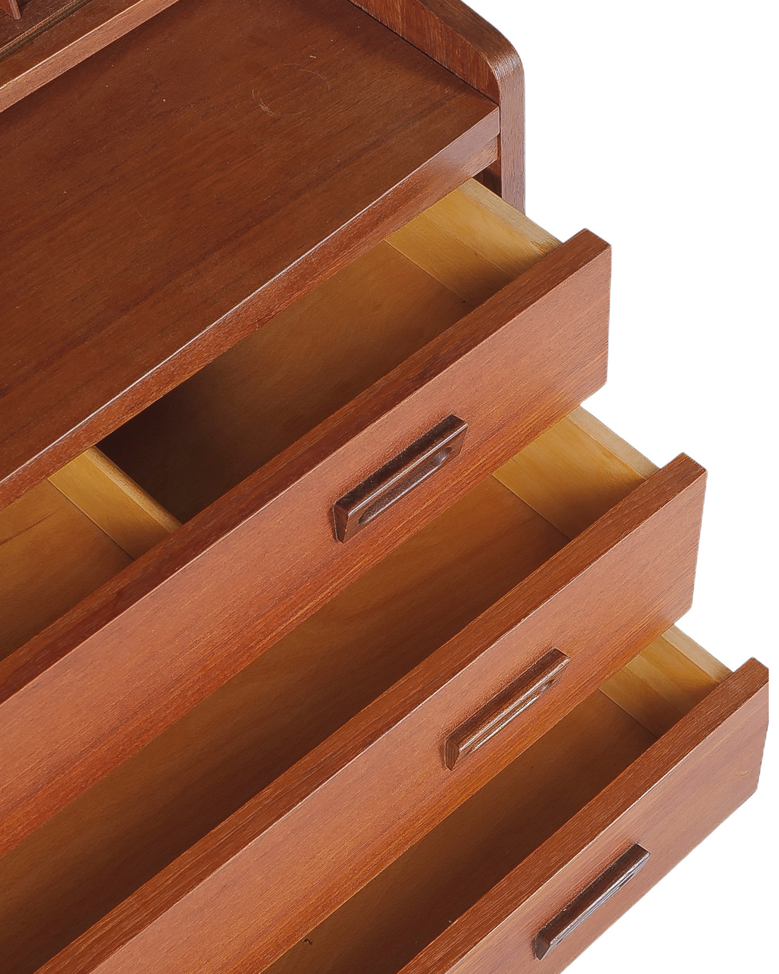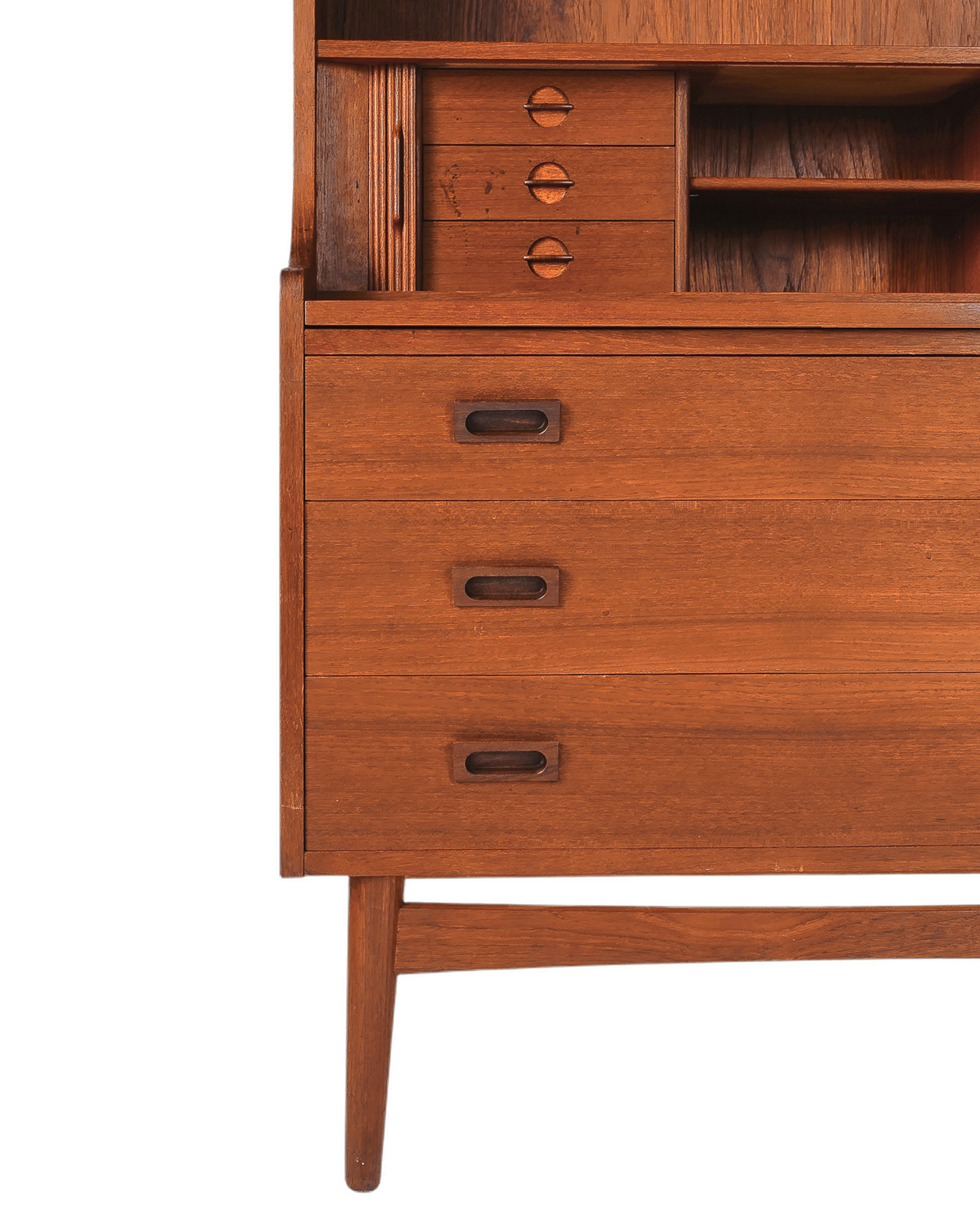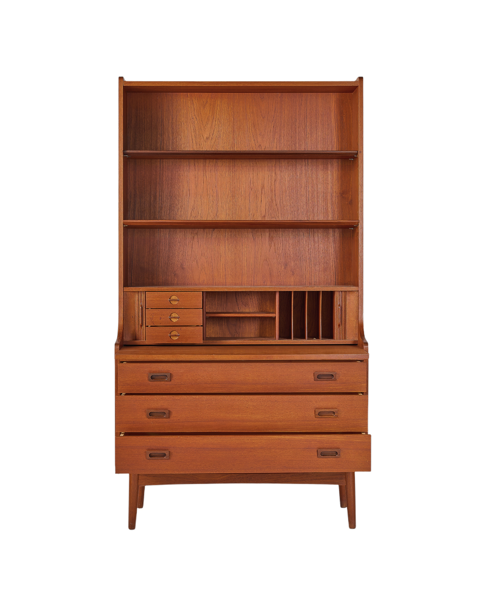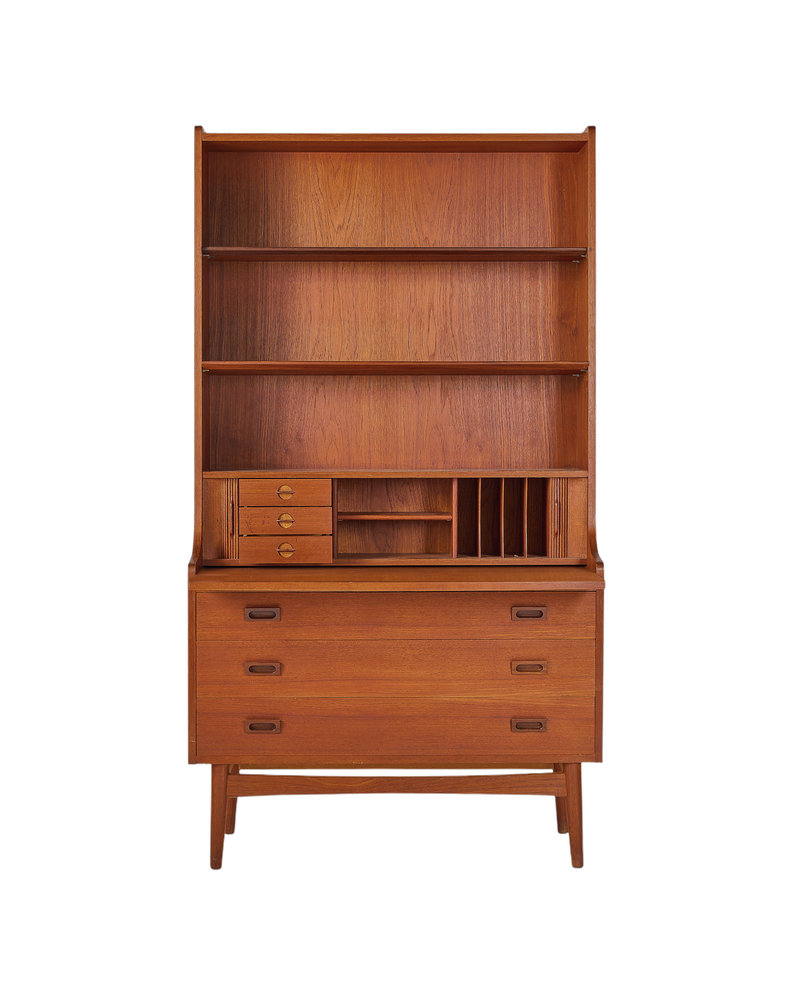 "우드 애호가 분들이라면 어디에선가 한 번쯤은 보셨을 북케이스입니다. 앞모습이 특별히 아름다운 가구이지만 45도 각도에서 보는 실루엣은 더욱 아름답습니다. 탁월한 수납공간과 서랍형 책상, 부드럽게 열고 닫는 탬부어 도어는 이 가구를 더욱 특별하게 만들어줄 요소입니다." - 빈티지 가구 컬렉터 이00 님